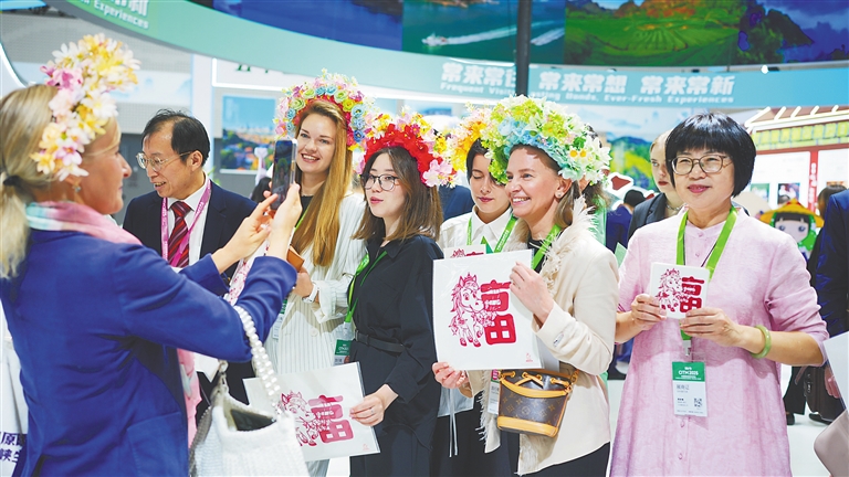 在2025中国国际旅游交易会境内展区,参会嘉宾头戴簪花合影。高林 摄