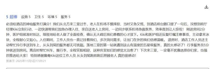 三亚凤凰机场酒店则用高效应急服务温暖了北方游客一家。一名老年游客在机场不慎摔倒,到店后向前台随口提及,前厅经理立刻加急办理入住,亲自护送老人至房间,同时同步联系机场急救医务。短短2分钟后,医护组便抵达房间为老人做全面检查。后续前厅经理与医护组反复叮嘱注意事项,主动拿来冰块,入住期间工作人员也多次询问需求。退房时,酒店工作人员还主动帮忙拎行李送抵车上,让游客感慨“落地三亚的第一站就遇到这么有温度的五星级服务,真的太感动了”。