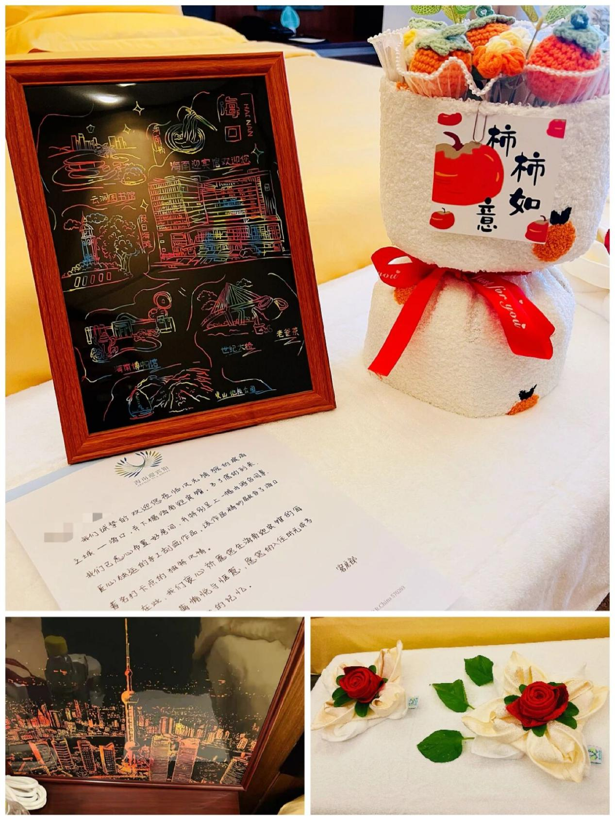 海南迎宾馆多次为宾客打造专属体验。针对从上海远道而来参与会议的宾客,行政管家吴桂秋与培训经理马月联合策划“上海情愫”主题接待,准备东方明珠夜景的手工刮画、融合海口本土文化与酒店特色的手工画作、手工花束,让客人对这份惊喜赞不绝口,悉心珍藏手工画作。