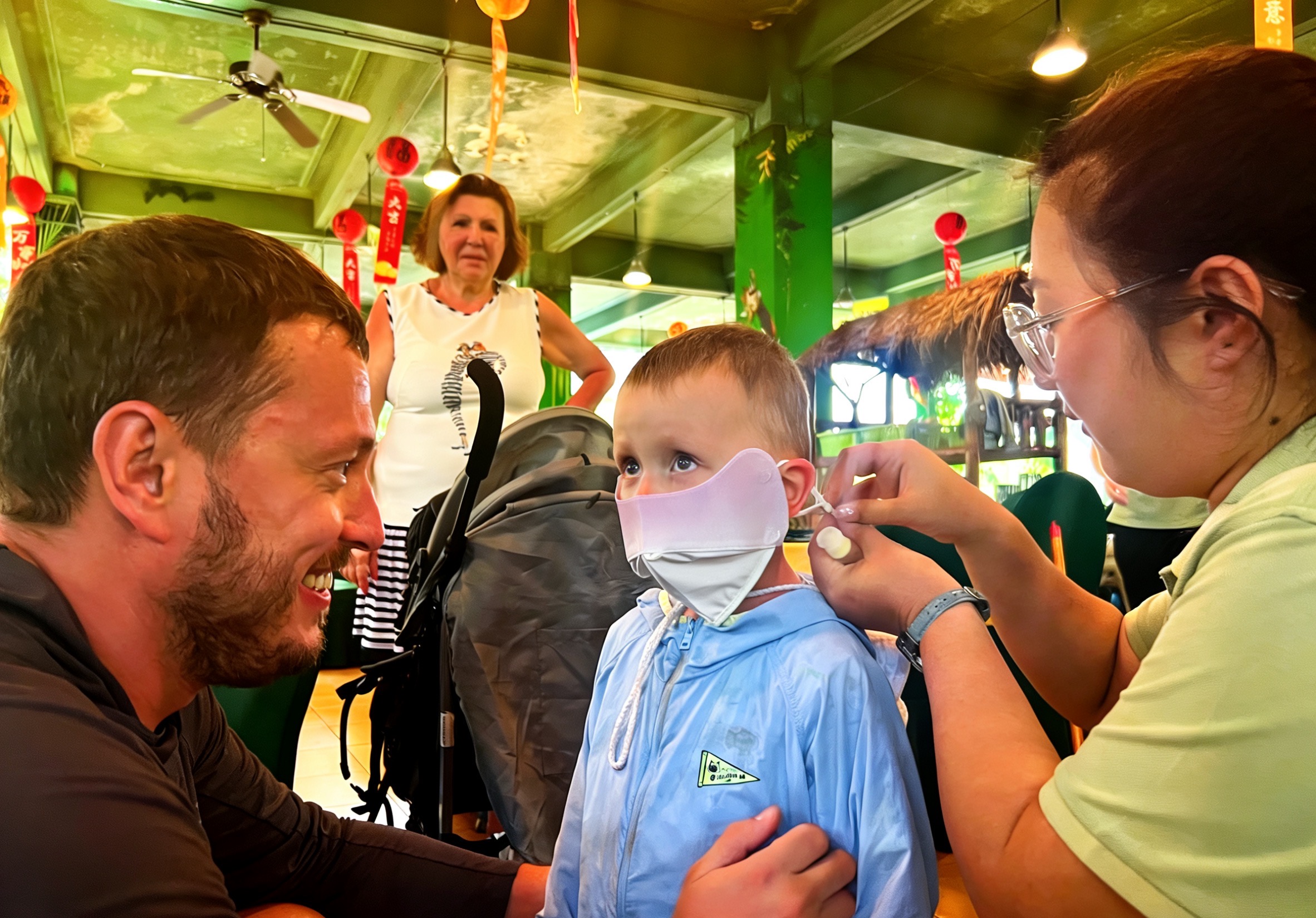 海南热带野生动植物园志愿者协助游客佩戴防晒口罩