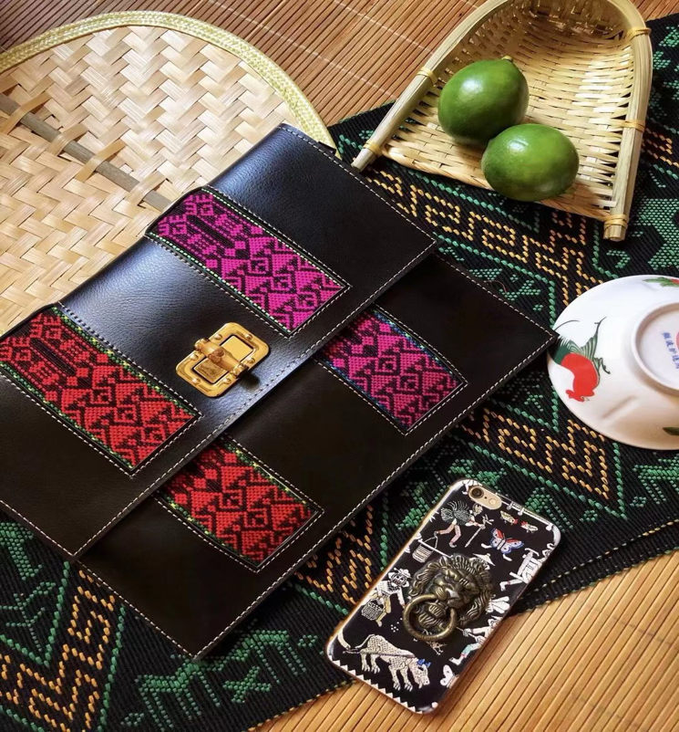 我还发现了拼接了黎族传统纹样的包包:图案藏着巧思,日常背出门,简约又有辨识度。一针一线,都是时间的礼物。