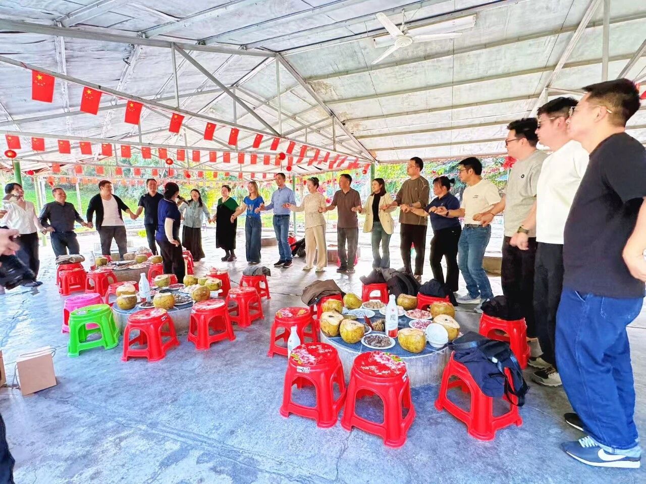 游客在海垦蓝洋樱花乐园开展团建活动。