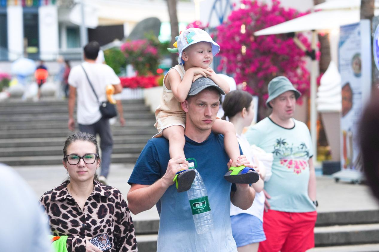 三亚大东海旅游区,外籍游客带着小朋友前来游玩。王程龙 摄