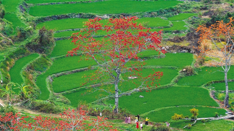游客在一处梯田观赏木棉花开。