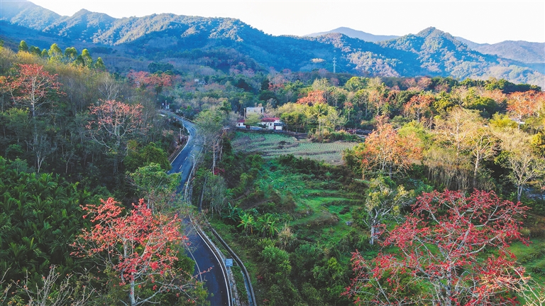 木棉之红,染红了山野,更点燃了当地百姓的生活。在排岸村,村民符爱梅在花季摆摊售卖圣女果,收入可观,让她不出远门便能吃上“旅游饭”;七叉镇机构村老人符建清手中精巧的藤编用具,一到赏花季便供不应求,“每年做的都不够卖”道出了他忙碌而踏实的喜悦;王下乡有了浪悦黎奢等精品民宿,真正将深山黎乡的“流量”转化为实实在在的“留量”。