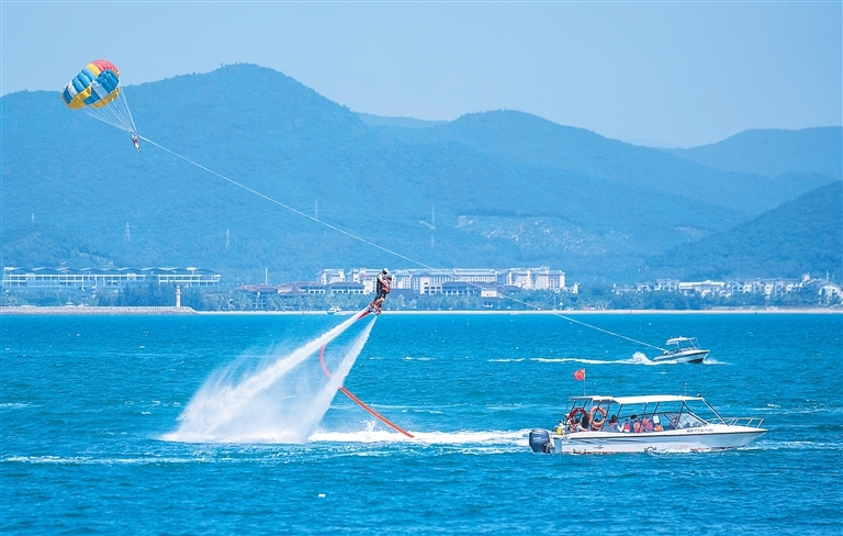 游客在三亚西岛附近海域体验水上飞人和拖伞项目 海南日报全媒体记者 李天平 摄