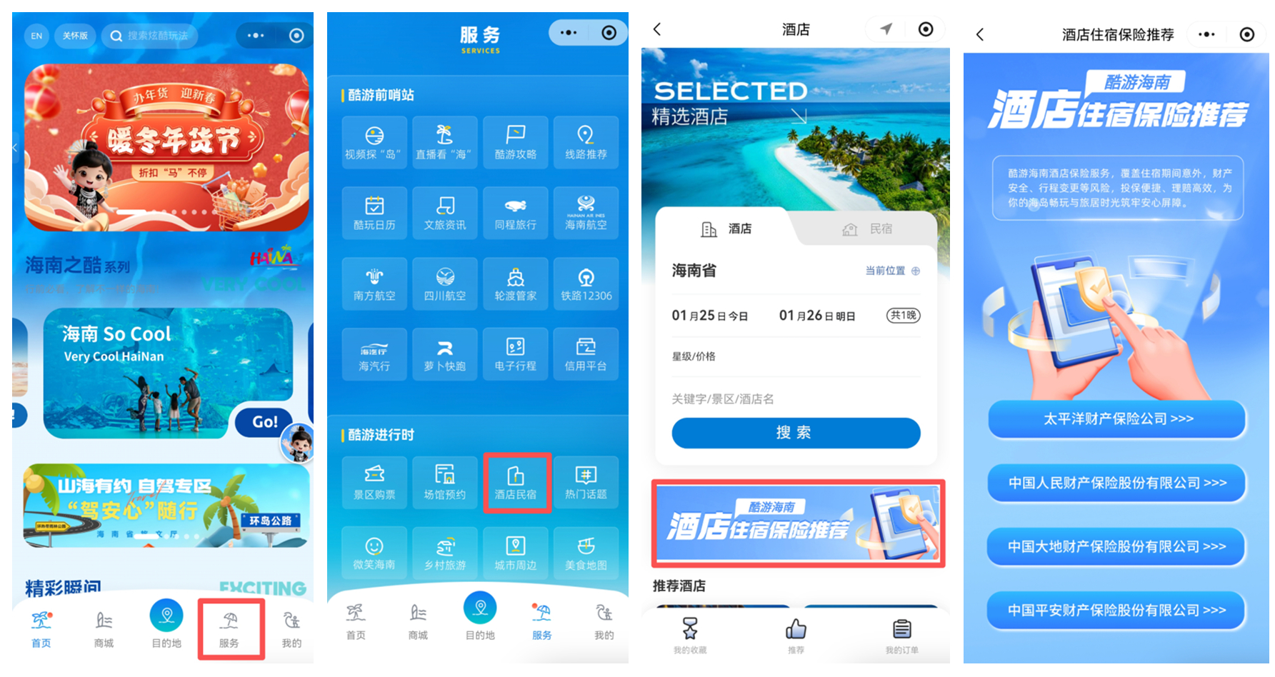 游客可登录“酷游海南”小程序,进入“服务”页面,在“酒店民宿”栏目中找到“酒店住宿保险推荐”选项,即可进行投保。