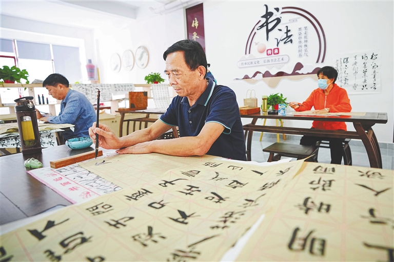 在三亚南滨居老年人日间照料中心,老年朋友们一起练习书法。海南日报全媒体记者 王程龙 摄