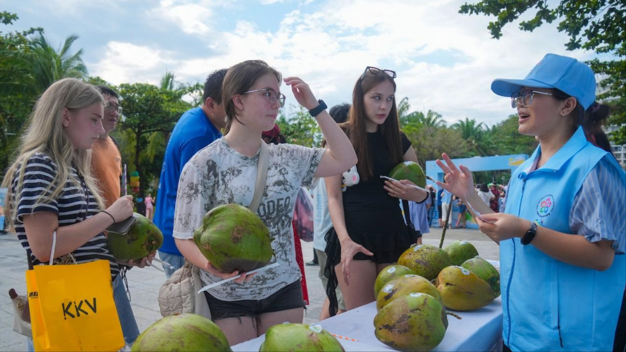 外籍游客在大东旅游区领取免费送的椰子。海南日报王程龙 摄